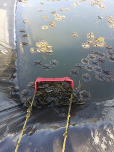 Je farfouille dans mon téléphone pour avoir un aperçu des photos de la semaine, et manque de bol, je n’ai encore eu d’yeux que pour mon bassin et mes nénuphars… Alors, on continue le feuilleton 😀 : après le filet de pêche à deux, je me suis lancé dans les finitions en solo avec une caisse de récolte lestée aux boules de pétanque (je n’ai plus le temps d’y jouer…) et guidée par une corde à noeuds (cf. photo 1). Ultra efficace! Il n’y a plus un nénuphar dans l’eau (cf. photo 2 😉 ). Et c’est bon pour mon épaule 🙂 !